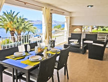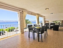 "Voramar", apt. di 4 locali 110 m2, piano rialzato. Oggetto adatto a 6 adulti. Arredamento molto funzionale e accogliente: soggiorno/sala da pranzo con finestra panoramica con tavolo da pranzo, TV, schermo piatto, climatizzazione e riscaldamento di aria calda. Uscita sulla terrazza. 1 camera matrimoniale grande con finestra panoramica con 1 letto matrimoniale e ventilatore. 1 camera matrimoniale con 1 letto matrimoniale. Uscita sulla terrazza. 1 camera matrimoniale con 1 x 2 letti a castello (90 cm). Cucina abitabile (forno, lavastoviglie, 3 piastre cottura in vetroceramica, tostapane, bollitore elettrico, forno a microonde, congelatore, macchina da caffè elettrica) con tavolo da pranzo. 2 bagni/docce/WC. Grande terrazza, piccola terrazza, gazebo. Mobili da terrazza, mobili da balcone, loggia. Magnifica vista sul mare, sulle montagne e sulla baia. A disposizione: lavatrice, ferro da stiro, asciugacapelli. Internet (wifi, gratis). Adatto alle famiglie. ETVPL12736- Attività nelle vicinanze