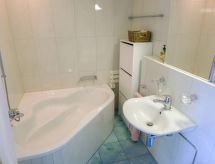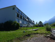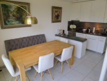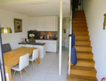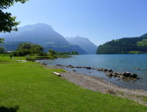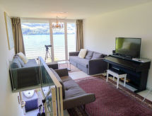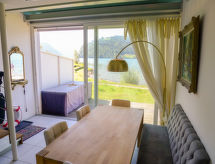 "waterfront stays", appartamento su due livelli 2 locali 60 m2, al pianterreno. Arredamento confortevole e moderno: soggiorno/sala da pranzo. Uscita verso il posto a sedere all’aperto. Cucina aperta (forno, lavastoviglie, 4 piastre cottura in vetroceramica, tostapane, macchina da caffè elettrica). Bagno/WC. Piano superiore: soggiorno/camera con 1 divano letto doppio e TV (via cavo) (schermo piatto). WC separato. Posto a sedere all’aperto. Mobili da terrazza. Bella vista sul lago, sulle montagne e sul paesaggio. A disposizione: Internet (wifi, gratis). Parcheggio vicino alla casa. Prego notare: appartamento per non fumatori.- Strutture