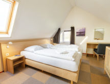 "Premium Cottage", huis 3-kamers 94 m2 op 2 verdiepingen. Comfortabel ingericht: hal met aparte WC. Woon-/eetkamer met eettafel, Digitale TV, stereo-installatie en DVD. Uitgang naar het terras. 1 2-pers. kamer met 2 bedden. Open keuken (4-pits kookplaat, afwasmachine, elektrische koffiemachine, combimagnetron). Zitbad. Bovenverdieping: (steile trap), 1 2-pers. kamer met afgeschuinde daken met 2 bedden en Flatscreen TV. Douche/WC. Terras. Terrasmeubelen, bergruimte. Ter beschikking: sauna, telefoon (extra), kinderstoel, kinderbed, haardroger. Internet (Internet (WiFi), gratis). Parkeerplaats bij het huis. Let op: rookmelders.- Uitrusting