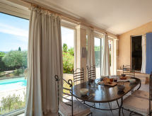 Gargas 4 km van Roussillon: Eengezinswoning "Les Iris", bouwjaar 1989, gerenoveerd in 2014. Buiten de plaats. Voor alleengebruik: terrein 1.300 m2 (omheind), openluchtzwembad beveiligd (10 x 4 m, 80 - 150 cm diepte, seizoensgebonden beschikbaarheid: 01.Mei. - 30.Sep.) met trap. Parkeerplaats op het terrein. Carport. Winkel 2 km, levensmiddelenwinkel 2 km, restaurant 2 km. Let op: auto noodzakelijk. Afdak voor 1 auto. Garage alleen bestemd voor motoren en fietsen.Interior