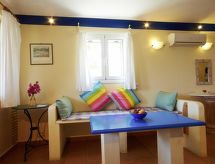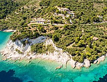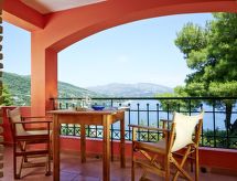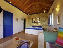 Groot, mooi, comfortabel appartement "Villas Cavo Marathia 4* Apartments", bouwjaar 1998, gerenoveerd in 2020, omgeven door bomen en weiden. Huisraad: fitnessruimte, air-conditioning, alarmsysteem, massage, biljart, wasserette, wasmachine (voor medegebruik, extra), droger (voor medegebruik, extra). Parkeergelegenheid: parkeerplaats nabij huis. Toegang tot aan het huis is met de auto het hele jaar mogelijk. Steile weg, smalle weg. Per auto aanbevolen, trappenweg, 6 treden. Gelegen: buiten de plaats Limni Keri, boven Bay of Marathias, geïsoleerd, rustig, verhoogd, zonnig gelegen te midden van groen, tegen een helling, aan de zee. Uitzicht vanuit de woning op zee en het landschap. In de omgeving van het huis: terrein (voor medegebruik), tuin (voor medegebruik), openluchtzwembad (voor medegebruik, lengte 7 m x breedte 5 m). Infrastructuur en afstanden: winkel 2.5 km, supermarkt 2.5 km, levensmiddelenwinkel 2.5 km, restaurant 800 m, steenstrand 50 m, baai 800 m, zandstrand 2.5 km, kiezelstrand 800 m, rotsstrand 800 m. Private access path to a private little romantic bathing bay (pebble, rocks, no beach) within a five minute walking distance through an olive grove right below the residence for a refreshing bath, swim or snorkeling (no beach facilities available). An idyllic pebble beach and tavernas are 800 m away and can be reached by foot. Two diving bases, bars, restaurant and shopping amenities are five minutes by car. Bed linen and towels are provided, as well as room service every second day. Rental car recommended. WLAN in all public areas. Pet friendly accommodation (extra: cleaning fee). Family-run business since 1998.Interior