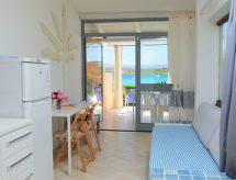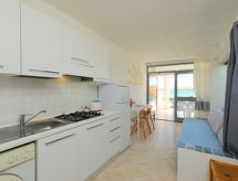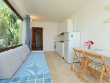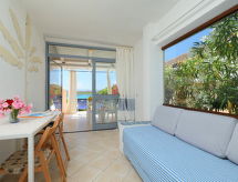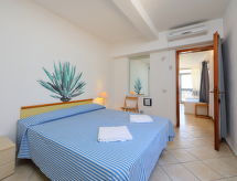 "Vista Mare 4", appartement 2-kamers 40 m2, op de begane grond. Eenvoudig ingericht: woon-/eetkamer met 1 divanbed, 1 uitschuifbaar bed, Sat-TV en air-conditioning. Uitgang naar het terras. 1 2-pers. kamer. Kookhoek (4-pits kookplaat, diepvriezer). Douche/bidet/WC. Boiler (30 liter). Terras. Terrasmeubelen. Uitzicht op zee. Ter beschikking: wasmachine. Let op: 1 huisdier/hond toegestaan. Privé ingang. IUN:Q3446- Uitrusting