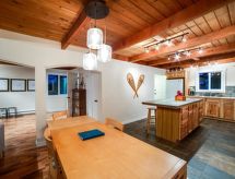 4-rom hus for 10 mennesker, 150 m2 på 2 etasjer, koseligt møbler. Stue/spise rom med DVD og vedovn. Røyking ikke tillatt. Sove rom med 1 dobbel seng. Sove rom med 1 dobbel seng. Sove rom med 2 enkel seng og 1 dobbel seng. Open kjøkken med 4 varme plater, oven, oppvaskmaskin og fridge. Bad/WC og shower/WC. Uteplass. Annet utstyr: vaskemaskin, tørketrommel, boblebad. Takket være vaskemaskinen finner du mindre klær å bære. Den har en tørketrommel. Det er en DVD-spiller.- Kjennetegn ved boligen