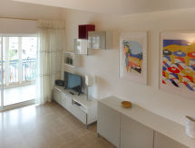 3 rom leilighet 52 m2 på 2 etasjer i 4th etasje. Praktiskt og vakkert møbler: stue/spisestue med, TV. Utgang til terrassen. 1 rom med, 1 dobbeltseng (160 cm, lengde 200 cm). Utgang til terrassen. Kjøkken (ovn, 4 keramiske kokeplater, brødrister, vannkoker, mikrobølgeovn, frys, elektrisk kaffemaskin). Bad, sep. WC. øverste etasje: 26 m2, med skråtak, 1 rom med 4 senger (90 cm). Terrasse 12 m2. Liggestoler. Utsikt av havet og havnen. Fasiliteter: vaskemaskin, strykejern, hårføner. Garasje plass nr 22 (NIV. -1), høyde 185 cm, bredde 205 cm. Vennligst merk: parkeringsplass bare for små biler. Røykvarsler. Bad i huset. Ferieboligen har en passasjerheis. For din velvære, nyt boblebadet i ferier. En vaskemaskin er tilgjengelig for bruk.- fasiliteter