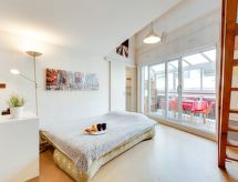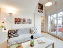 1 rom leilighet 40 m2 i 3rd etasje. Passer for 2 voksne + 2 barn. Enkelt og praktiskt møbler: stue/spisestue med, 1 dobbel sovesoffa (160 cm, lengde 200 cm), TV (flatskjerms TV), elektrisk oppvarming. Utgang til loggiaen. 1 rom med skråtak med 2 senger (80 cm lengde 190 cm). Lite kjøkken (4 keramiske kokeplater, brødrister, vannkoker, mikrobølgeovn, elektrisk kaffemaskin). Bad/WC. Fasiliteter: vaskemaskin, strykejern, hårføner. Internett (trådløs LAN [WLAN], gratis). Vennligst merk: kjæledyr / hund tillatt 1 kjæledyr / hund tillatt. Røykvarsler. 64483001886B8 Residence. Ikke bare er kjæledyr tillatt her, men deres hund er også en velkommen gjest. Det er en balkong. Den har en baby seng.- Kjennetegn ved boligen