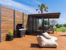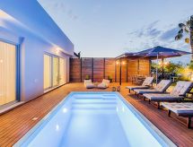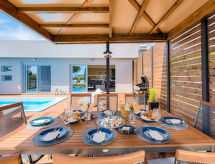 "Anastasia", 5 rom villa 160 m2. Romlig og lys, vakkert og moderne møbler: åpen stue med, satelit-TV (flatskjerms TV). Utgang til hagen, til badebassenget. 2 dobbelt rom, hvert rom med, 1 dobbeltseng, dusj/WC og satelit-TV (flatskjerms TV). 2 dobbelt rom, hvert rom med 2 senger, dusj/WC og satelit-TV (flatskjerms TV). Åpent kjøkken (stekeovn, 4 keramiske kokeplater, brødrister, vannkoker, mikrobølgeovn, elektrisk kaffemaskin) med liten spisebord. Airconditioning. Vakker utsikt av havet. Fasiliteter: vaskemaskin, strykejern, hårføner. Internett (trådløs LAN [WLAN], gratis). 1103939 Hagen vår inviterer deg til å nøle. Med utsikt over havet. Det er en parkeringsplass. Det har et privat basseng. Den har en komfyr.- fasiliteter