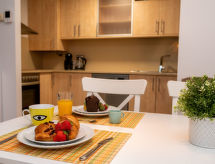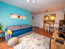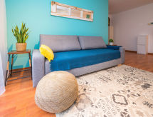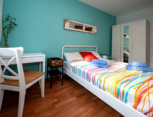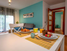 "Ancora", 3 rom leilighet 57 m2 i 1st etasje. Komfortabelt og moderne møbler: stue/spisestue med, spisebord, digital TV, gassoppvarming og air-conditioning. Utgang til balkongen. 1 rom med, 1 dobbeltseng (140 cm, lengde 200 cm), gassoppvarming og vifte. 1 rom med, 1 x 2 køysenger (90 cm, lengde 190 cm), gassoppvarming og vifte. Kjøkken (stekeovn, oppvaskmaskin, 4 keramiske kokeplater, brødrister, mikrobølgeovn, elektrisk kaffemaskin). Bad/bidé/WC. Balkong. Balkongmøbler. Fasiliteter: vaskemaskin, tørketrommel, strykejern, hårføner. Internett (trådløs LAN [WLAN], gratis). HUTB064369 Praktisk med heisen til inngangsdøren. Takket være vaskemaskinen finner du mindre klær å bære. Den har en Internett-tilkobling.- fasiliteter