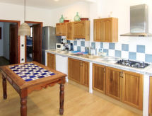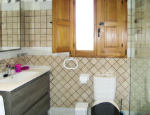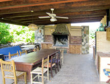 "Angeleta (ATE225)", 5 rom hus 150 m2 på 2 etasjer. Rustikt møbler: stue/soverom med, 2 klappsenger, vedovn, spisebord og TV. Utgang til terrassen. 1 rom med, 1 dobbeltseng (150 cm, lengde 180 cm). Kjøkken (oppvaskmaskin, 4 gassbrennere, mikrobølgeovn, frys, elektrisk kaffemaskin, pizzaovn). Dusj/WC. øverste etasje: (utendørs trapp) stue/spisestue med, spisebord. 2 rom, hvert rom med, 1 dobbeltseng (150 cm, lengde 180 cm). Åpent kjøkken (ovn, 4 keramiske kokeplater, mikrobølgeovn, frys). Dusj/WC. Parkett. 2 terrasser delvis dekt. Terrassemøbler, grill, liggestoler (4). Fasiliteter: vaskemaskin, høy barnestol barneseng. Internett (trådløs LAN [WLAN], ekstra). Vennligst merk: røykfri bolig. Ingen innvendig dør mellom etasjene. AT-470149-A Den har en terrasse. En oppvaskmaskin er tilgjengelig. Det er en brannkasse. Huset er også utstyrt med parkeringsplass. Et basseng er tilgjengelig. Et privat basseng er tilgjengelig.- fasiliteter