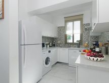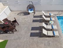 5-rom hus, frakoblet, for 8 mennesker, 130 m2, moderne møbler. Stue/spise rom med satelit-TV og DVD. Røyking ikke tillatt. Internett (Wireless LAN [WLAN]). Sove rom med 1 dobbel seng. Sove rom med 1 dobbel seng. Sove rom med 1 dobbel seng. Sove rom med 1 dobbel seng. Kjøkken med mikro wave, oven, spise bord, oppvaskmaskin, fridge og dyp fryser. Bad-rom, bad/WC, shower og shower/WC. Balkong, uteplass, terrasse møbler. Annet utstyr: safe, hårføner, strykejern, vaskemaskin. Røyking i leiligheten er forbudt. En veranda er til stede. Huset er også utstyrt med et basseng. Hvis været ikke spiller, er det også en TV. En vaskemaskin er tilgjengelig for bruk. Det er WLAN (Wireless Local Area Network). En DVD-spiller er tilgjengelig. En ovn er tilgjengelig.- Kjennetegn ved boligen