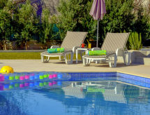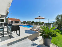 3 rom hus 110 m2, på bakkeplan, beliggenhet mot sør. Stue/spisestue 50 m2 med, 1 dobbel sovesoffa (160 cm, lengde 190 cm), satelit-TV (flatskjerms TV), air-conditioning. Utgang til terrassen. 2 rom, hvert rom med, 1 dobbeltseng (2 x 90 cm, lengde 200 cm). Åpent kjøkken (ovn, oppvaskmaskin, 4 keramiske kokeplater, mikrobølgeovn, frys, elektrisk kaffemaskin). Dusj/WC, bad/dusj/bidé/WC. Terrasse 30 m2 delvis dekt, terrasse 40 m2. Terrassemøbler, liggestoler (6). God utsikt av havet. Fasiliteter: barneseng, hårføner. Internett (trådløs LAN [WLAN], gratis). Huset er også utstyrt med en terrasse. Det er en overbygd parkeringsplass. Den har et basseng. Et privat basseng er tilgjengelig. Huset er også utstyrt med biljardbord. Et bordtennisbord er tilgjengelig. En mikrobølgeovn er tilgjengelig.- fasiliteter