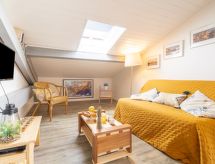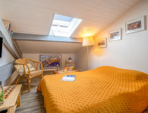 2 rom leilighet 35 m2 i 2nd etasje. Enkelt møbler: stue/spisestue med, 1 dobbel sovesoffa (1 x 140 cm, lengde 190 cm). 1 rom med, 1 dobbeltseng (140 cm, lengde 190 cm). Åpent kjøkken (3 induksjonskomfyr, brødrister, vannkoker, mikrobølgeovn, elektrisk kaffemaskin). Dusj/WC. El-oppvarming. Fasiliteter: vaskemaskin, tørketrommel, strykejern, hårføner. Internett (trådløs LAN [WLAN], gratis). Parkeringsplass. Vennligst merk: røykvarsler. 64185000215C Residence. En tørketrommel er tilgjengelig.- Kjennetegn ved boligen