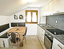 "Bergfink Dachgeschoss", 4 rom leilighet 84 m2 i 3rd etasje. Delvis, med skråtak, renovert i 2013, vakkert og koseligt møbler: stue/spisestue med, satelit-TV (flatskjerms TV), stereoanlegg. Utgang til balkongen, beliggenhet mot vest. 1 dobblet rom med skråtak med 2 senger. Utgang til balkongen, beliggenhet mot sør. 1 litet rom med 2 senger. 1 rom med, 2 skapsenger og satelit-TV (flatskjerms TV). Utgang til balkongen, beliggenhet mot sør. Med sluttende tak kjøkken (ovn, oppvaskmaskin, 4 keramiske kokeplater, elektrisk kaffemaskin) med spisebord. Bad/WC, dusj/WC. Balkong. Balkongmøbler, liggestoler (2). Vakker utsikt av fjellene, landskapet og området. Fasiliteter: Internett (trådløs LAN [WLAN], gratis). Parkeringsplass ved hbrukt. Vennligst merk: røykfri bolig. Kjæledyr / hund tillatt 1 kjæledyr / hund tillatt. The room with 2 fold-away beds has a small kitchen with 3 hot plates and an oven (studio apartment). Med inngjerdet tomt. Huset er også utstyrt med et trådløst lokalnettverk (WLAN). Det er en komfyr.- Kjennetegn ved boligen