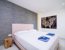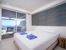 "Blue Infinity", 4 rom leilighet 120 m2. Passer for 4 voksne + 2 barn. Lys, vakkert og moderne møbler: åpen stue/spisestue med, digital TV, air-conditioning og varmluft oppvarming. Utgang til terrassen. 1 rom med, 1 dobbeltseng (1 x 160 cm, lengde 200 cm), dusj/WC, dobbel servant, air-conditioning og varmluft oppvarming. Utgang til terrassen. 1 rom med, 1 dobbeltseng (1 x 160 cm, lengde 200 cm), air-conditioning og varmluft oppvarming. 1 rom med, 1 uttrekkbar seng (2 pers. 2 x 90 cm, lengde 200 cm), air-conditioning og varmluft oppvarming. Åpent kjøkken (stekeovn, oppvaskmaskin, 3 induksjonskomfyr, brødrister, vannkoker, mikrobølgeovn, elektrisk kaffemaskin). Dusj/WC. Stor terrasse. Terrassemøbler. Panoramautsikt av havet og landskapet. Fasiliteter: vaskemaskin, strykejern, høy barnestol barneseng for barn opp til 2 år, hårføner. Internett (trådløs LAN [WLAN], gratis). Parkeringsplass. R000000001 Du kan ta heisen til gulvet i leiligheten. Et solarium er tilgjengelig og er tilgjengelig på eiendommen. Klimaanlegget sørger for god romtemperatur. Fordi den følelsesvennlige faktoren spiller en viktig rolle og er viktig for oss. Et basseng er tilgjengelig. For å forberede noe raskt selv, er en mikrobølgeovn klar. Den har en komfyr.- fasiliteter