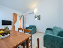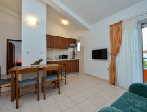 2 rom leilighet 35 m2 i 2nd etasje, beliggenhet mot sør-vest. Stue/spisestue med, 1 dobbel sovesoffa (160 cm, lengde 200 cm), satelit-TV og air-conditioning. Utgang til balkongen. 1 rom med, 1 dobbeltseng (2 x 80 cm, lengde 200 cm). Åpent kjøkken (2 kokeplater, vannkoker, mikrobølgeovn). Dusj/WC. Balkong 8 m2. Balkongmøbler. Utsikt av svømmebassenget. Fasiliteter: Internett (trådløs LAN [WLAN], gratis). Kjæledyr / hund tillatt 1 kjæledyr / hund tillatt. Vi tilbyr også våre gjester frokost. Med inngjerdet tomt. Den undertrykkende varmen kan legge stor belastning på kropp og sinn. Derfor er lokalene utstyrt med air condition. En veranda er til stede.- fasiliteter