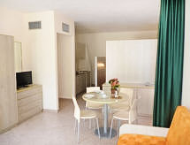 1 rom etromsleilighet 30 m2. Praktiskt møbler: stue/spisestue med, 1 sovesoffa, 1 uttrekkbar seng, 2 sovemuligheter og satelit-TV. Kjøkkenkrok (2 kokeplater, mikrobølgeovn). Badekar eller dusj/WC. Airconditioning, varmluftsoppvarming. Liten hage. Balkongmøbler. Fasiliteter: Internett (trådløs LAN [WLAN], gratis). Vennligst merk: kjøleskap uten frys. Kjæledyr / hund tillatt 1 kjæledyr / hund tillatt. CITR:008031-RT-0002 Ta bare hunden din med deg i stedet for å overlevere den til slektninger eller til kjæledyret pensjonat. Fordi din firbente venn er velkommen her. En resepsjon er til din disposisjon for denne ferien. Et solarium er tilgjengelig og er tilgjengelig på eiendommen. Selv om det forblir så varmt om natten, er det fint, du kan skru på klimaanlegget og sove i et hyggelig, temperert inneklima. Den har en parkeringsplass. Huset er også utstyrt med et barnebasseng. Hvis været ikke spiller, er det også en TV. Den har en Internett-tilkobling. Ved rengjøring.- Kjennetegn ved boligen