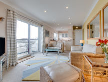 3 rom leilighet i 2nd etasje. Romlig og lys, komfortabelt og smakfullt møbler: åpen stue med, TV, flatskjerms TV og DVD. 1 dobblet rom med, 1 dobbeltseng og TV (flatskjerms TV), radio, CD-spiller og DVD. 1 rom med 2 senger. Åpent kjøkken (4 kokeplater, ovn, mikrobølgeovn, frys) med spisebord. Bad/dusj/WC. Oppvarming. Terrassemøbler. Vakker utsikt av havet. Fasiliteter: vaskemaskin, tørketrommel. Internett (trådløs LAN [WLAN], gratis). Vennligst merk: røykfritt hus. For din velvære, nyt boblebadet i ferier. Hvis været ikke spiller, er det også en TV. Et trådløst LAN (trådløst lokalnettverk) er tilgjengelig. En tørketrommel er tilgjengelig. En DVD-spiller er tilgjengelig. En mikrobølgeovn er tilgjengelig.- Kjennetegn ved boligen