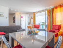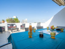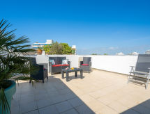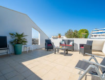 3 rom leilighet 53 m2 på 2 etasjer i 4th etasje. Vakkert møbler: 1 rom med, 1 dobbeltseng (140 cm), air-conditioning. 1 barnerom med 2 senger (90 cm), air-conditioning. Utgang til loggiaen. Bad, sep. WC. øverste etasje: (vindeltrapp) stue/spisestue med, TV (flatskjerms TV), air-conditioning. Utgang til terrassen. Åpent kjøkken (ovn, oppvaskmaskin, 4 keramiske kokeplater, mikrobølgeovn, frys). Oppvarming. Terrasse 35 m2, beliggenhet mot sør-vest terrasse 15 m2, beliggenhet mot sør-vest. Terrassemøbler, overbygd balkong. Utsikt av havet. Fasiliteter: vaskemaskin. Internett (trådløs LAN [WLAN], ekstra). Parkeringsplass. Vennligst merk: røykvarsler. Residence. Et badekar er tilgjengelig. Praktisk med heisen til inngangsdøren. En oppvaskmaskin er tilgjengelig. En mikrobølgeovn er også tilgjengelig.- Kjennetegn ved boligen