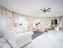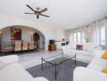 Cumbre del Sol: Stor hus "Cielo Azul", med 2 etasjer. I området Cumbre del Sol 8 km fra sentrum av Moraira, i en roligt, solrikt posisjon på toppen av en høyde, boligområde, 2.5 km fra sjøen, 2.5 km fra stranden. Privat: tomt 1'000 m2 (inngjerdet), svømmebasseng nyre-formet (5 x 10 m, dybde 100- 210 cm dyp, Sesongåpent: 01.Jan. - 31.Des.) med innebygde trapper. Parkering. Supermarked, restaurant, bakeri 700 m, sandstrand "Playa Ampolla" 8 km småstenstrand "Cala Moraig" 2.5 km. Vennligst merk: bil anbefales. Velegnet for barnefamilier.Interior