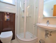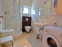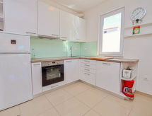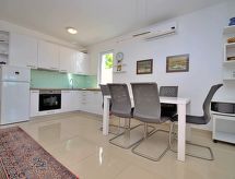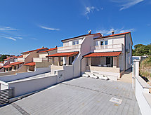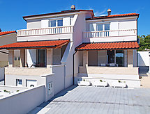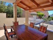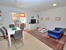 5 rom halvpart av tomannsbolig 100 m2 på 2 etasjer, beliggenhet mot sør-vest. Stue/spisestue med, satelit-TV (flatskjerms TV), DVD og air-conditioning. Utgang til terrassen. 1 rom med, 1 dobbel sovesoffa (140 cm, lengde 200 cm). Åpent kjøkken (ovn, oppvaskmaskin, 4 keramiske kokeplater, mikrobølgeovn, frys, elektrisk kaffemaskin). Dusj/WC. øverste etasje: inngang med, air-conditioning. 1 rom med, 1 dobbeltseng (2 x 90 cm, lengde 200 cm). Utgang til terrassen. 1 rom med, 1 dobbeltseng (2 x 90 cm, lengde 200 cm). 1 rom med, 1 dobbel sovesoffa (140 cm, lengde 200 cm). Dusj/WC. Terrasse 15 m2, dekt, terrasse 8 m2. Terrassemøbler. Delvis utsikt av havet. Fasiliteter: strykejern, høy barnestol barneseng (ekstra), hårføner. Internett (trådløs LAN [WLAN], gratis). Klimaanlegget sørger for god romtemperatur. Fordi den følelsesvennlige faktoren spiller en viktig rolle og er viktig for oss. Passer til grill. Det er en DVD-spiller.- fasiliteter
