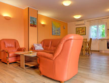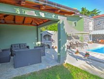 Kastav 7 km fra Opatija: Enmannsbolig "Dante", med 2 etasjer. I det lille tettstedet Marčelji 6 km fra sentrum av Kastav, 10 km fra sentrum av Rijeka, 12 km fra sentrum av Opatija, i en roligt, solrikt posisjon, 11 km fra sjøen, i det grønne. Privat: tomt 1'600 m2 (inngjerdet), svømmebasseng kantete, oppvarmt (7 x 3 m, 24 m2, dybde 140 cm, Sesongåpent: 18.Apr. - 10.Okt.) med bassengrensningssystem med saltelektrolyse. Utendørs dusj, terrasse (100 m2), hagemøbler, grill. I hbrukt: internetilkobbling, badstu, vaskemaskin. Parkering (for 4 biler) ved hbrukt på tomten, privat garasje. Butikk 700 m, restaurant 1.7 km, småstenstrand 11 km.Interior