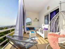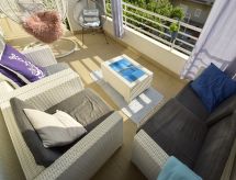3 rom leilighet 60 m2 i 1st etasje, beliggenhet mot sør. Stue/spisestue med, 1 sovesoffa (140 cm, lengde 200 cm), satelit-TV (flatskjerms TV), air-conditioning. Utgang til terrassen. 1 rom med, 1 dobbeltseng (160 cm, lengde 200 cm), dusj/WC. 1 rom med, 1 dobbeltseng (160 cm, lengde 200 cm). Åpent kjøkken (4 kokeplater, ovn, oppvaskmaskin, mikrobølgeovn, frys, elektrisk kaffemaskin). Bad/WC. Terrasse 12 m2, dekt. Terrassemøbler. Delvis god utsikt av havet og området. Fasiliteter: vaskemaskin, barneseng. Internett (trådløs LAN [WLAN], gratis). Parkeringsplass (inngjerdet). Kjæledyr / hund tillatt 1 kjæledyr / hund tillatt. Det er en oppvaskmaskin. Et innendørsbasseng er tilgjengelig. Et oppvarmet basseng er tilgjengelig. Huset er også utstyrt med internettforbindelse.- Kjennetegn ved boligen