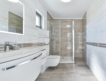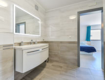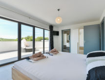 5 rom halvpart av tomannsbolig 260 m2 på 2 etasjer, beliggenhet mot sør-øst. Moderne møbler: stue/spisestue 45 m2 med, 1 sovesoffa (125 cm, lengde 220 cm), 1 klappseng (80 cm, lengde 190 cm), satelit-TV (flatskjerms TV), air-conditioning. Utgang til terrassen. 1 rom 20 m2 med, 1 dobbeltseng (180 cm, lengde 200 cm), dusj/WC og satelit-TV (flatskjerms TV), air-conditioning. Utgang til balkongen. Åpent kjøkken (ovn, oppvaskmaskin, 4 keramiske kokeplater, brødrister, vannkoker, mikrobølgeovn, frys, elektrisk kaffemaskin). Sep. WC. øverste etasje: 2 rom 20 m2, hvert rom med, 1 dobbeltseng (180 cm, lengde 200 cm), dusj/WC og satelit-TV (flatskjerms TV), air-conditioning. Utgang til terrassen. 1 rom 20 m2 med, 1 dobbeltseng (180 cm, lengde 200 cm), dusj/WC og satelit-TV (flatskjerms TV), air-conditioning. Utgang til balkongen. Varmluftsoppvarming. 2 balkonger 6 m2, terrasse 80 m2 delvis dekt, terrasse 38 m2, med tak. Terrassemøbler, liggestoler. Utsikt av svømmebassenget. Fasiliteter: safe, strykejern, barneseng. Internett (trådløs LAN [WLAN], gratis). La deg bli bortskjemt av den interne kokken. Et privat basseng er tilgjengelig. Takket være vaskemaskinen finner du mindre klær å bære.- fasiliteter