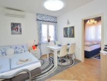 2 rom leilighet 35 m2 i 1st etasje, beliggenhet mot vest. Vakkert og koseligt møbler: stue/spisestue med, 1 dobbel sovesoffa (140 cm, lengde 200 cm), satelit-TV (flatskjerms TV), air-conditioning. 1 rom med, 1 dobbeltseng (160 cm, lengde 200 cm). Utgang til balkongen. Åpent kjøkken (oppvaskmaskin, 4 keramiske kokeplater, vannkoker, mikrobølgeovn, frys, elektrisk kaffemaskin). Dusj/bidé/WC. Balkong 4 m2. Balkongmøbler. Fasiliteter: Internett (trådløs LAN [WLAN], gratis). Dusj er forfriskende og en dusj er til stede. Lekeplassen, som er egnet for barn, er tilgjengelig. Det er en veranda. Den har et trådløst lokalnettverk (WLAN).- fasiliteter