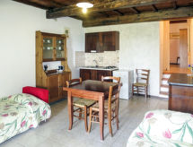 "Ginestre 2", 2 rom rekkehus 40 m2 på 2 etasjer, i forhøyet bunnetasje. Enkelt og rustikt møbler: stue/soverom med 1 seng (80 cm), 1 sovesoffa og spisebord. Utgang til hagen. Kjøkkenkrok (2 gassbrennere, vannkoker). øverste etasje: 1 rom med, 1 dobbeltseng (160 cm). Dusj/bidé/WC. Gassoppvarming. Sitteplass i hagen delvis dekt. Terrassemøbler. Vakker utsikt av landskapet. Fasiliteter: høy barnestol barneseng. Vennligst merk: max kjæledyr/små hunder tillatt 2 kjæledyr/små hunder tillatt. Egen inngang. En veranda er til stede. Takket være vaskemaskinen finner du mindre klær å bære. Den har et biljardbord. Det er et bordtennisbord.- fasiliteter