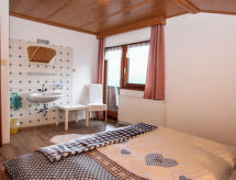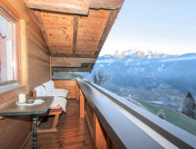 3 rom leilighet 55 m2 i 2nd etasje. Delvis, med skråtak, koseligt møbler: inngang. 1 rom med, 1 sovesoffa, 1 dobbeltseng og vaskeservant. Utgang til balkongen. 1 dobblet rom med, vaskeservant. Utgang til balkongen. Kjøkken/stue (ovn, oppvaskmaskin, 4 keramiske kokeplater) med, spisehjørne og satelit-TV (flatskjerms TV), radio. Dusj, sep. WC. Balkong, stor terrasse dekt. Terrassemøbler, grill, liggestoler. Hærlig panoramautsikt av fjellene og dalen. Fasiliteter: Internett (trådløs LAN [WLAN], gratis). Vennligst merk: egen inngang. Huset er også utstyrt med balkong. En internettforbindelse er tilgjengelig. Det er en komfyr.- fasiliteter