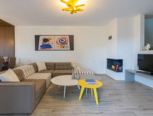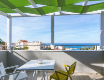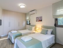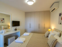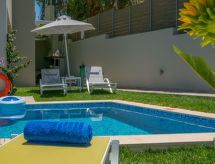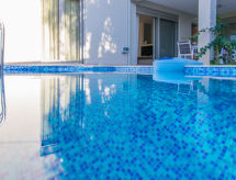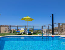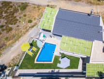 "Helianthos", 5 rom villa 147 m2 på 3 etasjer. Romlig og lys, komfortabelt og moderne møbler: åpen stue med, åpen peis og satelit-TV (flatskjerms TV), radio. Utgang til hagen, til badebassenget. 1 dobblet rom med, 1 dobbeltseng, dusj/WC og satelit-TV (flatskjerms TV). Utgang til hagen. Åpent kjøkken (ovn, oppvaskmaskin, 4 keramiske kokeplater, mikrobølgeovn, elektrisk kaffemaskin) med spisebord. Airconditioning. I underetasje: (trapp uten gelender), 1 rom med, massasjedusj. øverste etasje: (trapp uten gelender), 1 dobblet rom med, 1 dobbeltseng, dusj/WC og satelit-TV (flatskjerms TV). Utgang til balkongen. 1 dobblet rom med 2 senger, dusj/WC og satelit-TV (flatskjerms TV). Utgang til balkongen. Airconditioning. 2 balkonger. Grill. Vakker utsikt av havet. Fasiliteter: vaskemaskin, tørketrommel, safe, strykejern, hårføner. Internett (trådløs LAN [WLAN], gratis). Vennligst merk: velegnet for familier. Røykfritt hus. 1041 K910 0315 7801 Egnet for grilling. Det er en brannkasse. Det er en parkeringsplass. Det har et privat basseng. En tørketrommel er tilgjengelig. Ved rengjøring. Det er et bordtennisbord.- fasiliteter