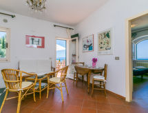 3 rom leilighet i to etasjer 55 m2 på 2 etasjer. Praktiskt og smakfullt møbler: 1 litet rom med 2 senger. Liten inngang. Utgang til hagen. øverste etasje: stue/spisestue med, TV. Utgang til terrassen. 1 dobblet rom med panoramavindu. Kjøkkenkrok (4 kokeplater, miniovn, mikrobølgeovn, elektrisk kaffemaskin). Utgang til terrassen. Bad/WC. Terrasse 40 m2. Balkongmøbler, sitteplass. Hærlig utsikt av havet. Fasiliteter: vaskemaskin, hårføner. Internett (trådløs LAN [WLAN], gratis). Parkeringsplass (1 Bil) ved hbrukt. Et badekar er tilgjengelig. Med inngjerdet tomt. Gir spektakulær utsikt over havet. Den har en veranda. En barneseng er tilgjengelig.- fasiliteter