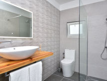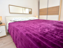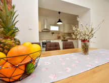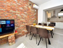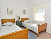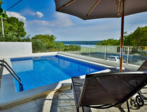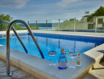 3 rom rekkehus 80 m2, beliggenhet mot sør-vest. Stue/spisestue 26 m2 med, 1 dobbel sovesoffa (150 cm, lengde 220 cm), satelit-TV (flatskjerms TV), air-conditioning. Utgang til terrassen. 1 rom med, 1 dobbeltseng (180 cm, lengde 200 cm). 1 rom med 2 senger (90 cm lengde 200 cm). Åpent kjøkken (ovn, oppvaskmaskin, 4 keramiske kokeplater, frys, elektrisk kaffemaskin). Dusj/WC. Liggestoler. God utsikt av havet. Fasiliteter: strykejern, høy barnestol barneseng, hårføner. Internett (trådløs LAN [WLAN], gratis). Kjæledyr / hund tillatt 1 kjæledyr / hund tillatt. Eiendommen er helt inngjerdet. Huset er også utstyrt med barneseng. Huset er også utstyrt med et privat basseng.- fasiliteter