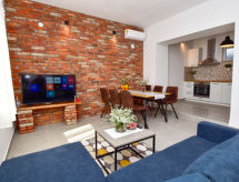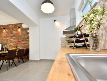 Ribnica 15 km fra Novigrad: Rekkehus "Ivan", renovert i 2020. 9 km fra sentrum av Obrovac, i en solrikt, høyt posisjon, 1 km fra sjøen, 1 km fra stranden. Underholdning av bassenget av eieren/gartneren. Privat: tomt 100 m2 (inngjerdet), svømmebasseng kantete (6 x 3 m, 21 m2, dybde 140 cm, Sesongåpent: 01.Apr. - 01.Nov.) med innebygde trapper. Terrasse (100 m2), hagemøbler. I hbrukt: internetilkobbling, vaskemaskin. Parkering ved hbrukt. Butikk 1.5 km, restaurant 2 km, småstenstrand 1 km.Interior