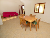 4 rom hus beliggenhet mot vest. Vakkert og koseligt møbler: stue/spisestue 30 m2 med, satelit-TV og air-conditioning. Utgang til terrassen. Inngang med, air-conditioning. 1 rom med, 1 dobbeltseng (160 cm, lengde 200 cm). 2 rom, hvert rom med, 1 dobbeltseng (2 x 90 cm, lengde 200 cm). Åpent kjøkken (4 kokeplater, ovn, frys). Bad/WC, dusj/bidé/WC. Airconditioning (ekstra). Terrasse 35 m2 delvis dekt. Terrassemøbler. Vakker utsikt av havet. Fasiliteter: Internett (trådløs LAN [WLAN], gratis). Vennligst merk: parkeringsplass bare for små biler. Utsikt over havet og beliggenheten er nydelig. Klimaanlegget sørger for god romtemperatur. Fordi den følelsesvennlige faktoren spiller en viktig rolle og er viktig for oss. Det er en overbygd parkeringsplass.- Aktiviteter i nærheten
