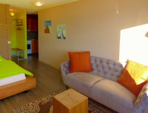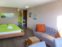 1 rom leilighet 33 m2 i 3rd etasje. Komfortabelt møbler: stue/soverom med, 1 dobbeltseng (160 cm, lengde 200 cm), kabel-TV og radio. Åpent kjøkken (3 kokeplater, stekeovn, brødrister, vannkoker, mikrobølgeovn, elektrisk kaffemaskin, Internet(NESPRESSO), ekstra, raclettegrill (ost)). Bad/WC. Balkong 7 m2, beliggenhet mot sør. Balkongmøbler, lager. Meget vakker utsikt av fjellene og dalen. Fasiliteter: hårføner. Internett (trådløs LAN [WLAN], gratis). Vennligst merk: røykfri bolig. Kjæledyr / hund tillatt 1 kjæledyr / hund tillatt. Residence. Dette er en ferie der hunden din er velkommen. Praktisk med heisen til inngangsdøren. Det er et basseng. Et innendørsbasseng er tilgjengelig. Huset er også utstyrt med et oppvarmet basseng.- Kjennetegn ved boligen