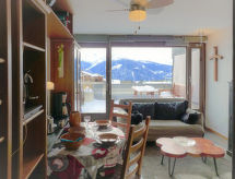 1 rom etromsleilighet 33 m2 i 2nd etasje. Vakkert møbler: stue/soverom med, 1 dobbeltseng (140 cm, lengde 200 cm), kabel-TV (flatskjerms TV), radio. Kjøkken (ovn, oppvaskmaskin, 4 induksjonskomfyr, brødrister, vannkoker, mikrobølgeovn, elektrisk kaffemaskin, Internet(Nespresso), ekstra, raclettegrill (chinoise, ost)). Bad/WC. Stor terrasse, beliggenhet mot sør. Terrassemøbler, elektrisk grill. Vakker utsikt av fjellene. Fasiliteter: hårføner. Internett (trådløs LAN [WLAN], gratis). Garasje plass nr 66, høyde 200 cm, bredde 210 cm. Vennligst merk: røykfri bolig. Kjæledyr / hund tillatt 1 kjæledyr / hund tillatt. Residence. Et badekar er tilgjengelig. Praktisk med heisen til inngangsdøren. Det er en badstue. Et innendørsbasseng er tilgjengelig. Huset er også utstyrt med et oppvarmet basseng.- Kjennetegn ved boligen