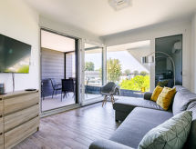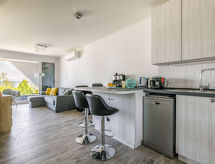 "Amarina", 2 rom leilighet 40 m2 i 3rd etasje. Moderne og smakfullt møbler: stue/soverom med, 1 uttrekkbar seng (2 pers.), kabel-TV og air-conditioning. Utgang til balkongen. 1 rom med, 1 dobbeltseng (180 cm, lengde 200 cm). Åpent kjøkken (4 kokeplater, stekeovn, oppvaskmaskin, brødrister, vannkoker). Dusj/WC, sep. WC. Balkong 10 m2. Balkongmøbler grill (flyttbar). Vakker utsikt av vannet. Parkeringsplass (overdekt, 1 Bil). Objekt med heis. Klimaanlegget sørger for god romtemperatur. Fordi den følelsesvennlige faktoren spiller en viktig rolle og er viktig for oss. En balkong er tilgjengelig. Passer til grill. Det er et oppvarmet basseng.- fasiliteter