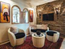4 rom leilighet 85 m2 i 2nd etasje. Komfortabelt og smakfullt møbler: inngang. 2 dobbelt rom. 1 rom med skråtak med 3 senger. Stue med, kabel-TV. Utgang til terrassen. Åpent kjøkken (oppvaskmaskin, 4 keramiske kokeplater, mikrobølgeovn) med, spisehjørne. 2 dusjer/WC, sep. WC. Terrasse 10 m2. Terrassemøbler. Hærlig panoramautsikt av landskapet. Fasiliteter: safe, hårføner. Internett (trådløs LAN [WLAN], gratis). Vennligst merk: røykfri bolig. Røykvarsler. Residence. All slags informasjon om et vellykket opphold er tilgjengelig i resepsjonen. Praktisk med heisen til inngangsdøren. Huset er også utstyrt med en terrasse. Det er WLAN (Wireless Local Area Network).- Kjennetegn ved boligen