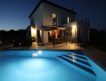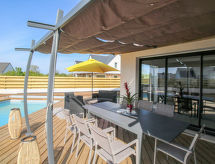"Lagon bleu", 4 rom hus. Komfortabelt og moderne møbler: stor stue/spisestue med panoramavindu med, spisebord og TV. Utgang til terrassen, pergola, til badebassenget, beliggenhet mot sør. 1 stort rom med, 1 dobbeltseng (160 cm, lengde 200 cm), dusj og dobbel servant. Åpent kjøkken (stekeovn, oppvaskmaskin, 4 induksjonskomfyr, brødrister, vannkoker, mikrobølgeovn, elektrisk kaffemaskin, Internet(Nespresso), ekstra) med bar. Sep. WC. øverste etasje: 1 rom med, 1 dobbeltseng (140 cm, lengde 190 cm). 1 rom med 1 seng (90 cm lengde 190 cm), 1 x 2 køysenger (80 cm, lengde 190 cm). Åpen galleri med, 1 dobbel sovesoffa (140 cm, lengde 190 cm). Utgang til terrassen. Dusj, sep. WC. El-oppvarming. Balkong, stor terrasse 50 m2, beliggenhet mot sør. Terrassemøbler, liggestoler (4). Fasiliteter: vaskemaskin, strykejern, høy barnestol barneseng for barn opp til 2 år, hårføner. Internett (trådløs LAN [WLAN]). Vennligst merk: røykfritt hus. Kjæledyr / hund tillatt 1 kjæledyr / hund tillatt. Røykvarsler. Fleksibel tildeling av senger: Det er flere sengeplasser tilgjengelig enn maksimalt antall tillatte personer. Dette kan imidlertid ikke overskrides. Eiendommen er helt inngjerdet. Det er en barneseng. Det er et basseng. Huset er også utstyrt med et privat basseng. Et oppvarmet basseng er tilgjengelig.- fasiliteter