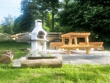 5 rom hytte 280 m2 på 2 etasjer. Romlig, med skråtak, komfortabelt og smakfullt møbler: inngang. Sammenhengende rom. Stor stue/spisestue med, 2 sovesoffaer, vedovn, satelit-TV, flatskjerms TV, radio, CD-spiller og DVD. Utgang til verandraen. 1 rom med 2 senger. Åpent kjøkken (stekeovn, oppvaskmaskin, 4 keramiske kokeplater, brødrister, vannkoker, mikrobølgeovn, frys, grill, elektrisk kaffemaskin, dampgryte) med bar, spisebord. Dusj/WC, bidé. øverste etasje: salong, med skråtak med, radio og CD-spiller. 2 rom med skråtak, hvert rom med 3 senger, satelit-TV og flatskjerms TV. 1 rom med skråtak med, 2 uttrekkbare senger (2 pers.), satelit-TV (flatskjerms TV). Dusj/WC, dobbel servant. El-oppvarming. Vennligst merk: kjæledyr/små hunder tillatt 2 kjæledyr/små hunder tillatt. Røykvarsler, brannslukkningsapparat. En ferie godbit for mennesker og dyr. Dette er en hund og katt vennlig ferie innkvartering. Ferieeiendom inkludert hage å slappe av. Passer til grill. Hvis været ikke spiller, er det også en TV. Det er en mikrobølgeovn tilgjengelig.- fasiliteter