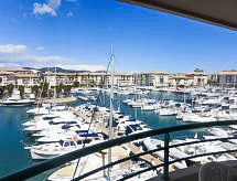 2 rom leilighet 45 m2 i 3rd etasje. Komfortabelt møbler: stue/spisestue med, 2 sovesoffaer (140 cm, lengde 190 cm), TV. Utgang til terrassen. 1 rom med, 1 dobbeltseng (1 x 140 cm, lengde 190 cm). Kjøkken (4 kokeplater, mikrobølgeovn, elektrisk kaffemaskin). Utgang til terrassen. Bad, sep. WC. Terrasse. Terrassemøbler. Vakker utsikt av havnen. Fasiliteter: vaskemaskin, tørketrommel. Internett (trådløs LAN [WLAN], ekstra). Parkeringsplass plass nr 6051 (overdekt), høyde 190 cm, bredde 250 cm. Vennligst merk: røykvarsler. Residence. Bad i huset. En veranda er tilgjengelig. Huset er også utstyrt med en overbygd parkeringsplass. En tørketrommel er tilgjengelig.- Kjennetegn ved boligen