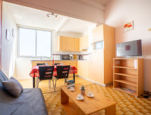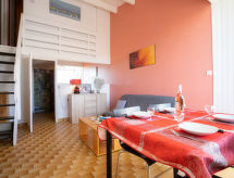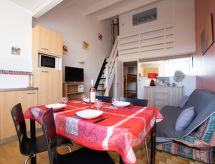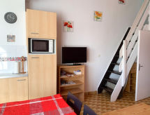 2 rom leilighet 32 m2 på 2 etasjer i 3rd etasje, østvendt beliggenhet. Stue/spisestue med, TV (flatskjerms TV). Alkove med, 1 x 2 køysenger (90 cm, lengde 190 cm). Åpent kjøkken (ovn, oppvaskmaskin, 4 keramiske kokeplater, mikrobølgeovn, elektrisk kaffemaskin). Dusj/WC. øverste etasje: (bratt trapp), 1 rom med 2 senger (90 cm lengde 190 cm). Fasiliteter: vaskemaskin. Internett (trådløs LAN [WLAN], ekstra). Parkeringsplass. Vennligst merk: røykvarsler. Residence. En internettforbindelse er tilgjengelig.- Kjennetegn ved boligen