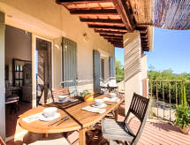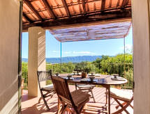 6 rom hus 160 m2 på 2 etasjer. Inngang. Stue 28 m2 med, åpen peis, TV, video og stereoanlegg. Utgang til terrassen. Spisestue med, 1 dobbel sovesoffa. 1 rom med 2 senger. 1 rom med, 1 dobbeltseng og dusj/WC. Kjøkken (4 kokeplater, ovn, oppvaskmaskin, mikrobølgeovn, grill). Dusj/WC. øverste etasje: 1 rom med, 1 dobbeltseng og dusj/WC. 1 rom med, 1 dobbeltseng (1 x 160 cm, lengde 200 cm), bad og bad/WC. Utgang til balkongen. Terrasse 35 m2. Terrassemøbler, liggestoler. Utsikt av. Fasiliteter: vaskemaskin. Internett (trådløs LAN [WLAN], gratis). Vennligst merk: røykvarsler. Huset er også utstyrt med oppvaskmaskin. Det er et privat basseng.- Aktiviteter i nærheten