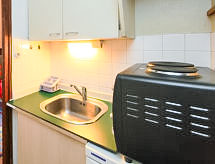 1 rom leilighet 20 m2 i 5th etasje. Stue/spisestue med, 1 dobbel sovesoffa og TV. Utgang til balkongen. Kjøkkenkrok (2 kokeplater, miniovn, vannkoker, elektrisk kaffemaskin). Dusj/WC. Liten balkong, beliggenhet mot nord-øst. Vakker utsikt av fjellene. Fasiliteter: Internett (trådløs LAN [WLAN], ekstra). Vennligst merk: ingen parkeringsplass. Max 1 lite kjæledyr / liten hund tillatt. Bare TV FR. Røykvarsler. Residence. Huset er også utstyrt med balkong. Den har en Internett-tilkobling.- Kjennetegn ved boligen