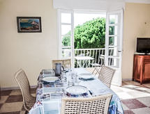 3 rom leilighet 65 m2 i 2nd etasje, beliggenhet mot sør. Stue/spisestue med, TV og air-conditioning. Utgang til terrassen, beliggenhet mot sør. 1 rom med 2 senger (90 cm lengde 190 cm). Utgang til balkongen, beliggenhet mot nord. 1 rom med, 1 x 2 køysenger (90 cm, lengde 190 cm). Kjøkken (miniovn, 3 induksjonskomfyr, brødrister, vannkoker, mikrobølgeovn, frys, elektrisk kaffemaskin). Utgang til terrassen. Bad, sep. WC. El-oppvarming. Liten balkong 5 m2, beliggenhet mot nord, terrasse 10 m2, beliggenhet mot sør. Terrassemøbler. Hærlig panoramautsikt av havet. Fasiliteter: vaskemaskin. Internett (trådløs LAN [WLAN], ekstra). Parkeringsplass ved hbrukt. Vennligst merk: max 1 lite kjæledyr / liten hund tillatt. Bare TV FR. Røykvarsler. 83112000238JX Et badekar er tilgjengelig. Dessuten er de bortskjemt med en klar utsikt over havet. Kom inn og føl deg den forfriskende brisen i klimaanlegget. En barneseng er tilgjengelig.- fasiliteter