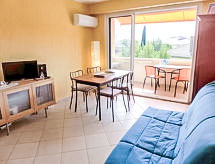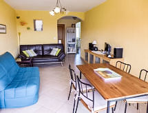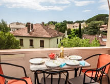 2 rom leilighet 45 m2 i 3rd etasje. Lys, vakkert møbler: stue/spisestue med, 1 dobbel sovesoffa (140 cm, lengde 190 cm), TV og internasjonale TVkanaler (flatskjerms TV), stereoanlegg, DVD og air-conditioning. Utgang til terrassen. 1 rom med, 1 dobbeltseng (140 cm, lengde 190 cm). Åpent kjøkken (stekeovn, oppvaskmaskin, 3 induksjonskomfyr, brødrister, vannkoker, frys, elektrisk kaffemaskin). Dusj, sep. WC. El-oppvarming. Terrasse 5 m2, dekt, beliggenhet mot sør-vest. Terrassemøbler. Fasiliteter: vaskemaskin, strykejern. Internett (trådløs LAN [WLAN], ekstra). Parkeringsplass plass nr 21. Vennligst merk: røykfri bolig. Røykvarsler, ingen heis. 83112 000070 S5 Residence. Vær oppmerksom på at røykeforbudet gjelder hele bygningen. Huset er også utstyrt med en terrasse. Det er en barneseng. Det er en DVD-spiller. En ovn er tilgjengelig.- Kjennetegn ved boligen