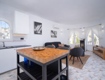 Benitachell: Hus "Lunella", bygget i 2003. I området Cumbre del Sol, i en roligt, solrikt posisjon ved en høyde, 2 km fra sjøen. Privat: tomt 450 m2, svømmebasseng (4 x 8 m, Sesongåpent: 01.Jan. - 31.Des.) med innebygde trapper. Utendørs dusj. Trapper (14 trinn) til hbrukt. Offentlig parkering på veien. Kjøpesenter, restaurant 500 m, sandstrand "Arenal" 14 km, badebukt 2 km. Golfbane 7.6 km. Forbedre handikapet ditt med en runde golf. En fabelaktig sport som kan praktiseres av alle like. Ikke langt fra feriehuset er en golfbane.Interior
