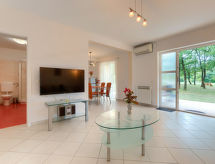 Tremannsbolig "Macini". 20 km fra sentrum av Rovinj, 6 km fra sentrum av Žminj, 33 km fra sentrum av Pula, i en avskildt posisjon, 20 km fra sjøen. Fellesbruk: uberørt tomt 15'000 m2 med trær, eng, 1 badebasseng (12 x 6 m, dybde 130 cm dyp, Sesongåpent: 04.Apr. - 06.Nov.). Utendørs dusj, tennis, basketball, volleyball, volleyball bane, hagemøbler (rutsjebane, huske). I hbrukt: internetilkobbling. Parkering på tomten. Butikk 4 km, restaurant 6 km, småstenstrand 20 km. Marina 20 km. Det er tennisbaner tilgjengelig. Så tennisentusiaster kan trene på alle nivåer.Interior