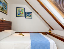 5 rom hus 130 m2 på 2 etasjer. 1 rom med, 1 dobbeltseng (2 x 80 cm, lengde 190 cm), dusj/WC og satelit-TV (flatskjerms TV). 1 rom med, 1 dobbeltseng (160 cm, lengde 200 cm), TV (flatskjerms TV). Spisestue med, air-conditioning. Åpent kjøkken (4 kokeplater, ovn, oppvaskmaskin, mikrobølgeovn, elektrisk kaffemaskin). Dusj/WC. Toppetasje: (utendørs trapp) stue/spisestue 45 m2, med skråtak, Lav dørhøyde 75 cm 240 cm med takvindu med, TV (flatskjerms TV), air-conditioning. 1 rom med skråtak Lav dørhøyde 75 cm 240 cm med takvindu med, 1 dobbeltseng (180 cm, lengde 190 cm). 1 rom med skråtak Lav dørhøyde 75 cm 240 cm med takvindu med, 1 dobbeltseng (160 cm, lengde 200 cm). Åpent kjøkken (4 kokeplater, ovn, oppvaskmaskin, mikrobølgeovn). Bad/WC. Liggestoler. Fasiliteter: høy barnestol barneseng. Internett (trådløs LAN [WLAN], gratis). Kjæledyr / hund tillatt 1 kjæledyr / hund tillatt. To-leggede og firbente venner på ferie er mulig her, fordi alle er velkommen her. Husdyr er tillatt. Klimaanlegget sørger for god romtemperatur. Fordi den følelsesvennlige faktoren spiller en viktig rolle og er viktig for oss. Et privat basseng er tilgjengelig.- Kjennetegn ved boligen