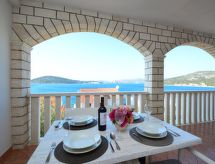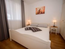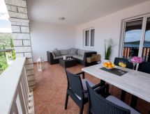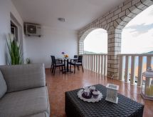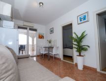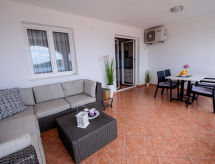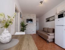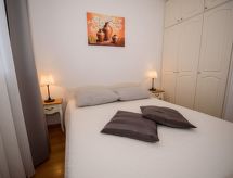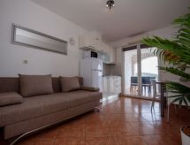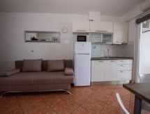 3 rom leilighet 45 m2 i 2nd etasje. Vakkert og smakfullt møbler: stue/spisestue med, satelit-TV (flatskjerms TV), air-conditioning. Utgang til terrassen. 2 rom, hvert rom med, 1 dobbeltseng (2 x 80 cm, lengde 200 cm). Åpent kjøkken (2 keramiske kokeplater, mikrobølgeovn, frys, elektrisk kaffemaskin). Dusj/WC. Airconditioning (ekstra). Stor terrasse 20 m2, dekt, beliggenhet mot sør. Terrassemøbler, liggestoler (2). Hærlig utsikt av havet. Fasiliteter: Internett (trådløs LAN [WLAN], ekstra). Dessuten er de bortskjemt med en klar utsikt over havet. Selv om det forblir så varmt om natten, er det fint, du kan skru på klimaanlegget og sove i et hyggelig, temperert inneklima. Den har en parkeringsplass. Den har en overbygd parkeringsplass.- fasiliteter